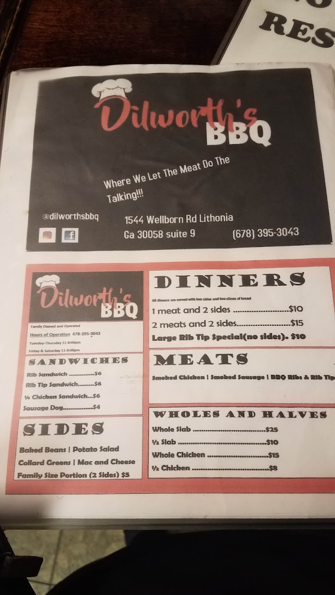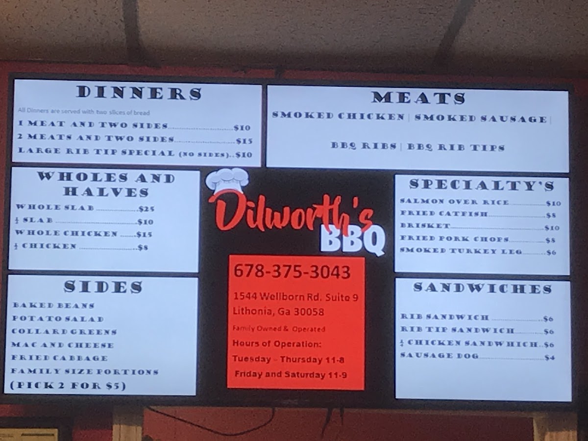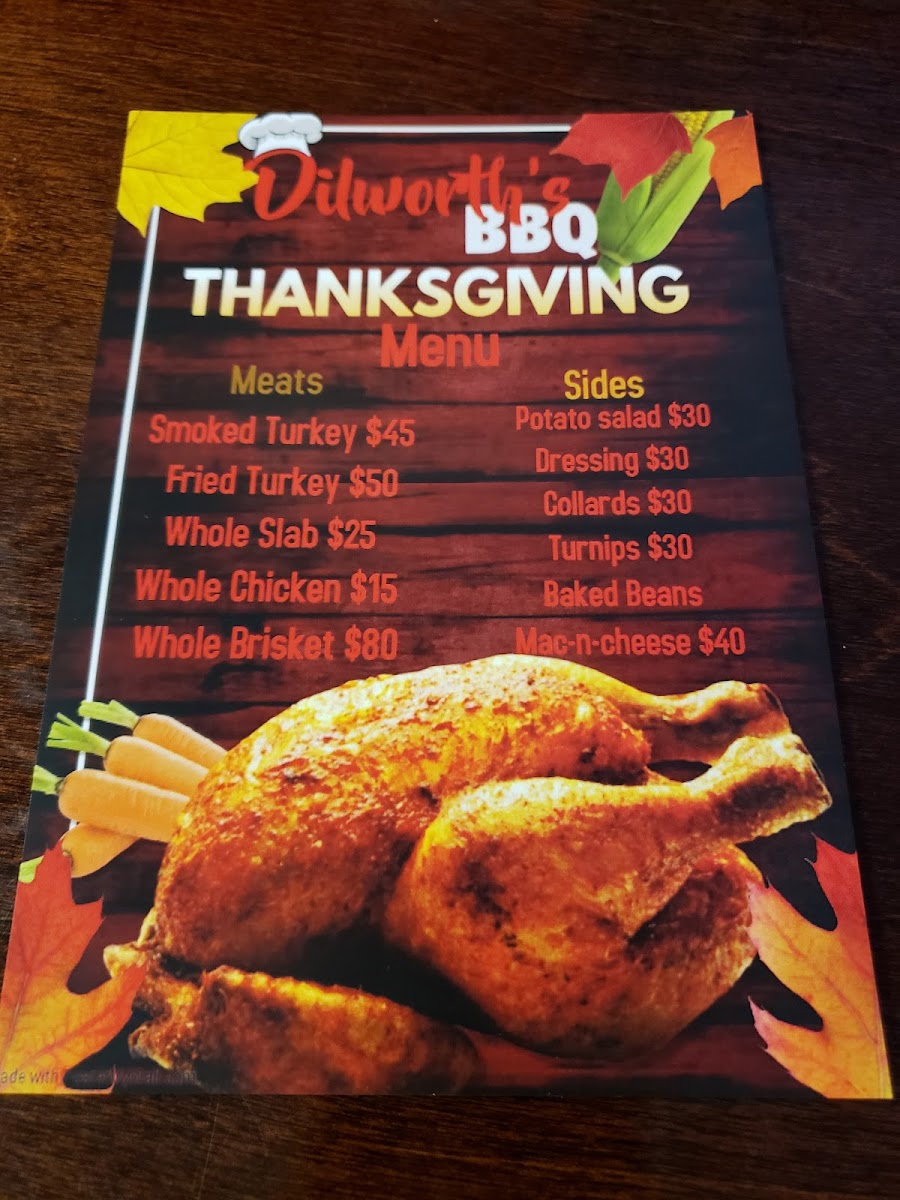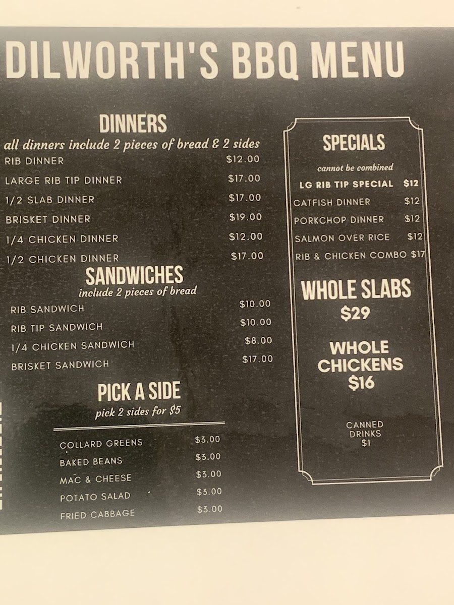 For something a little different, Dilworth's also offers some specialty dishes like Salmon Over Rice, Fried Catfish, Brisket, Fried Pork Chops, and Smoked Turkey Leg. These items provide a variety of flavors and textures, perfect for those seeking to try something unique alongside their traditional BBQ favorites.